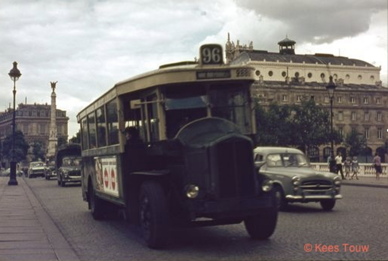 Parijs zomer 1966. Bus 96 op de ‘Pont au Change’ op de achtergrond rechts ‘Théâtre de la Ville’, links op de Place du Châtelet ‘La Fontaine du Palmier’ uit 1806-1808. De omwonenden konden er destijds water halen.