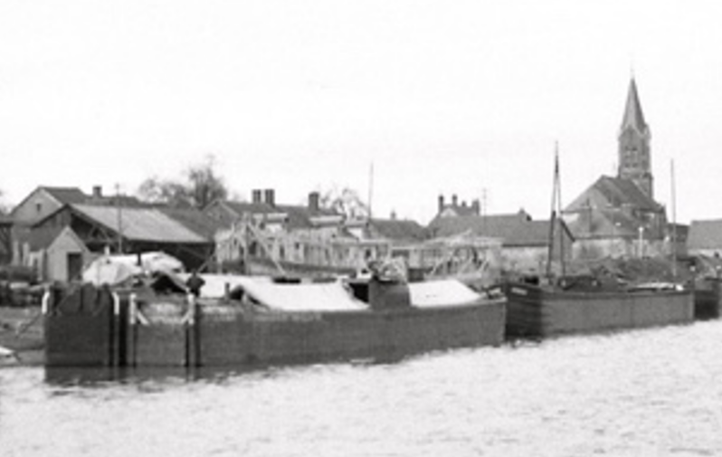 Marseilles-les-Aubigny, januari 1950. Niet zo ver van Nevers. Een aantal lege Berrichons met de opvallende dubbele roeren tegen het platte achterschip geklapt. Op de wal een ‘Flûte de Bourgogne’ in aanbouw. [Detail van een grotere foto gemaakt door E.W.H.Touw (1910-2007)]